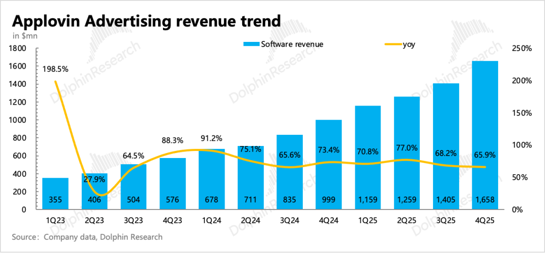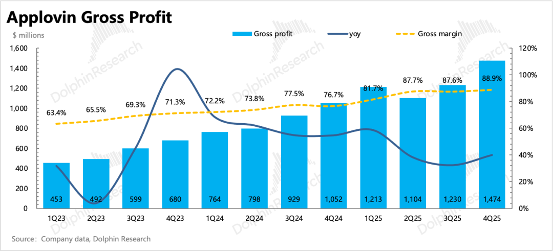 Combining the company's Q1 guidance and channel research, Dolphin Research expects game advertising revenue in Q1 to again exceed the long-term organic growth rate of 20%. This reflects Applovin's continued market share gains in the gaming sector, where it holds a dominant position—potentially alleviating some market concerns about Meta's return to iOS in-app advertising impacting Applovin.