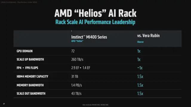 AMD is not merely competing on single-chip performance but aims to challenge NVIDIA's Vera Rubin NVL72 racks with its new 'Helios' rack system.