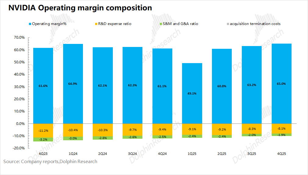 In the fourth quarter of the 2026 fiscal year, NVIDIA's core operating profit margin reached 65%, continuing to improve, primarily due to the recovery in gross profit margin and a decline in operating expense ratios.