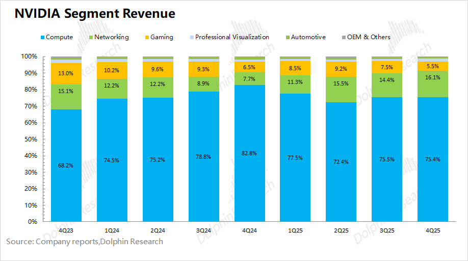 Driven by AI Capex, the revenue share of Nvidia's data center business (Compute+Networking) has exceeded 90%, while the gaming business's share has been squeezed to below 10%.