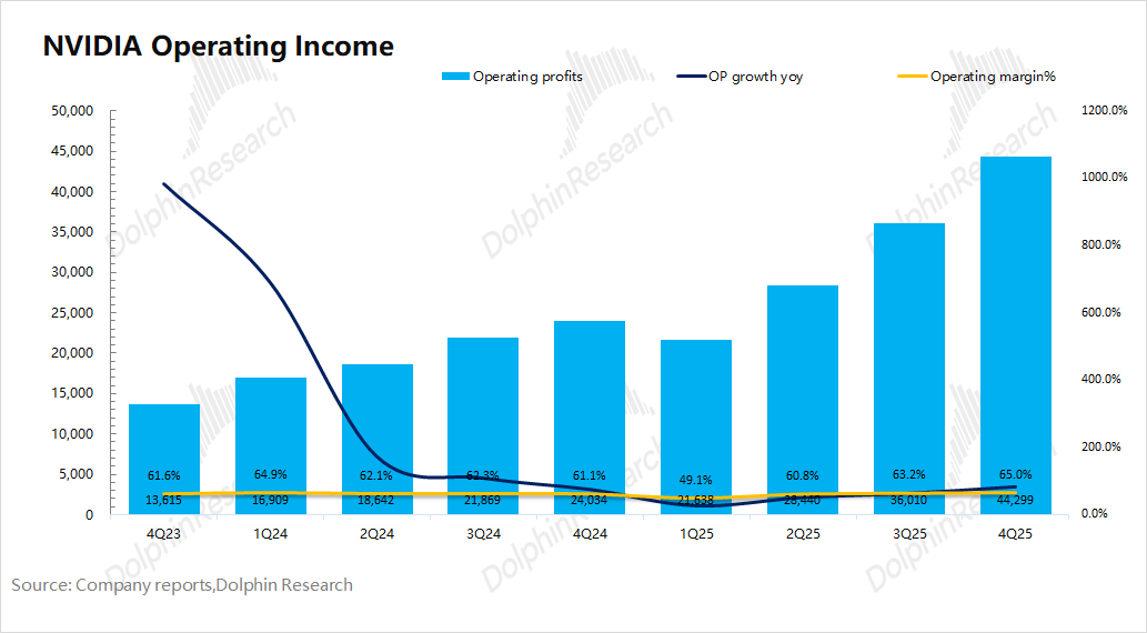Since net profit is also affected by non-operating items, Dolphin Research focuses more on the company's core operating profit (gross profit - R&D expenses - sales, administrative, and other expenses). The company's core operating profit for this quarter was $44.3 billion, up 84% year-on-year. The core operating profit margin increased to 65%.