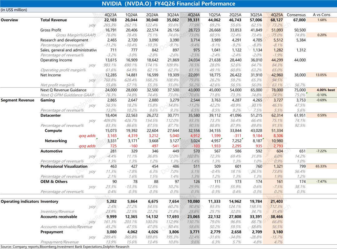 Nvidia (NVDA.O) released its Q4 FY2026 earnings report (as of January 2026) after the U.S. market closed in the early morning of February 26, 2026, Beijing time. Key details are as follows:
