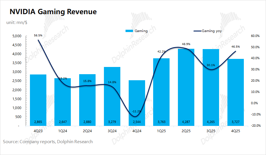 3.2 Gaming Business: In the fourth quarter of the 2026 fiscal year, NVIDIA's gaming business achieved revenue of $3.7 billion, up 46% year-on-year, primarily driven by shipments of products such as the RTX 50 series. The gaming business now accounts for less than 10% of the company's total revenue, with the company's current performance focus remaining on its data center business.