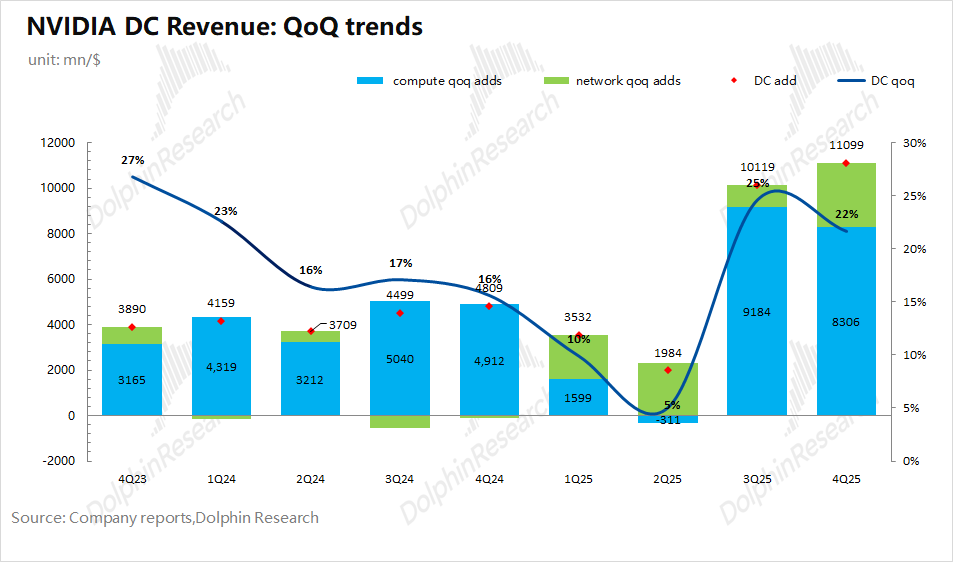 Breakdown: (1) Computing revenue was $51.3 billion this quarter, up $8.3 billion sequentially, with the accelerated mass production of the B300 contributing the most significant increment. (2) Networking revenue was $11 billion this quarter, up $2.8 billion sequentially.