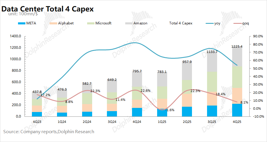 Combining capital expenditures and outlooks from various companies, Dolphin Research expects the four major core cloud providers (Google, Meta, Microsoft, and Amazon) to increase their capital expenditures to over $660 billion in 2026, up 62% year-over-year.