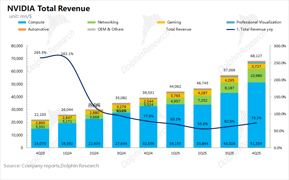 2.1 Revenue: In Q4 FY2026 (4Q25), Nvidia achieved revenue of $68.1 billion, up 73% year-over-year, surpassing the raised buyer expectations ($67 billion). The sequential increase of $11 billion in revenue this quarter was primarily driven by the data center business and the ramp-up of Blackwell series mass production.