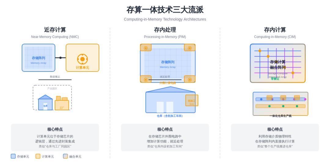 First, Near-Memory Computing (NMC). Computing units are located in the logic layer of memory chips or tightly integrated with memory through advanced packaging technologies. This is akin to building warehouses and factories in the same industrial park—still in separate locations, but much closer. High Bandwidth Memory (HBM) with integrated logic layers or 3D stacking technologies fall into this category.