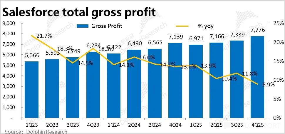 At the gross margin level, Salesforce's subscription revenue generated a gross profit of $7.87 billion in this quarter, a year-over-year increase of 9.8%. Although it still outpaced revenue growth, the trend was significantly slower than the 12.3% in the previous quarter.