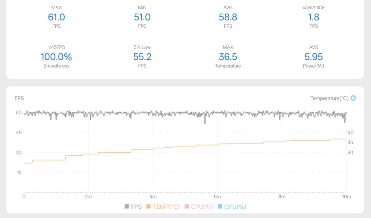 Here, Lei Technology has chosen "Wuthering Waves," currently one of the most demanding mobile games. We set it to ultra-high graphics at 60fps, turned off adaptive graphics, and played for half an hour, including exploring and defeating monsters. The average frame rate reached 58.8fps, with the device temperature around 42°C and core power consumption at 5.95W.