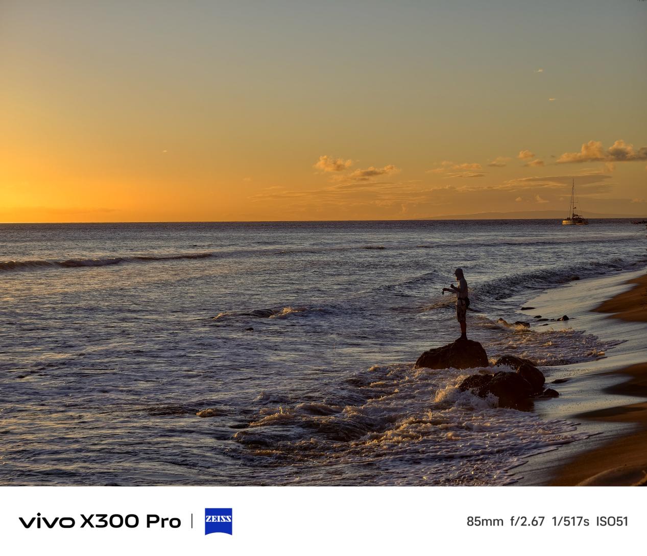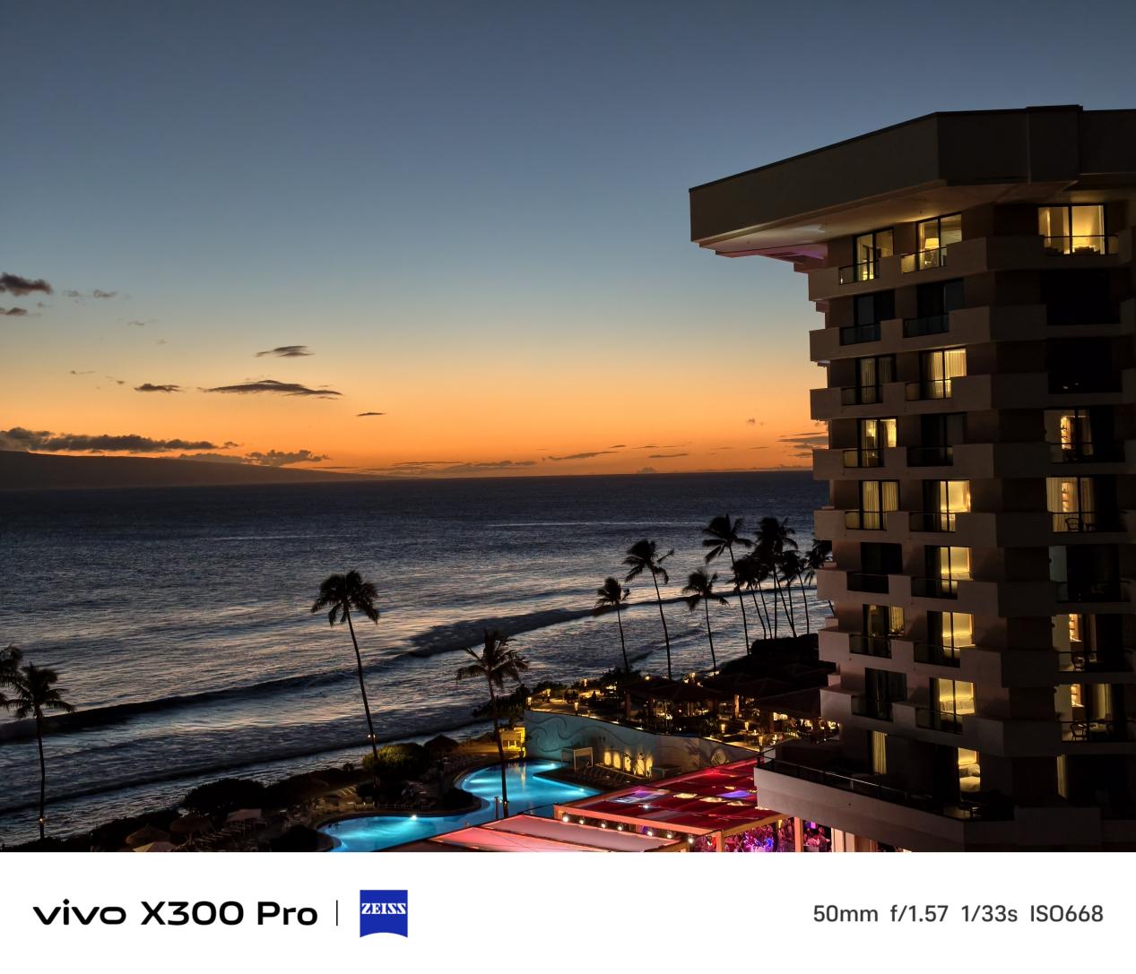 First, a sunset scene shot by the seaside. The image clearly shows the vivo X300 Pro's excellent control over light sources, preserving details like the sunset glow on the sea, indoor lights of nearby buildings, colored lights below, and even reflections on the water. The entire scene looks clean and textured.