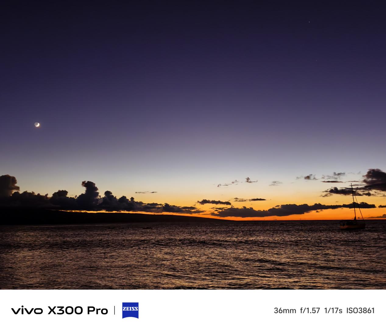 For example, in this nighttime sample taken on a hilltop with no light sources other than the fading sunlight and moonlight—meaning it was nearly pitch black—the vivo X300 Pro captured the remaining light in the scene. While preserving the transition between bright and dark areas, it increased overall brightness, resulting in an outstanding sunset shot.