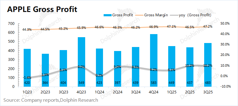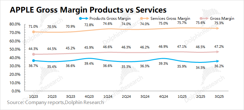 Apple's gross profit margin rose to 47.2%, up 1 percentage point YoY, outperforming the market consensus of 46.6%. The gross profit margin for software services improved to 75.3% YoY, while the hardware segment maintained a gross profit margin of 36.2% YoY.