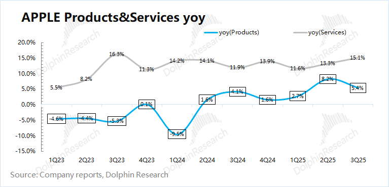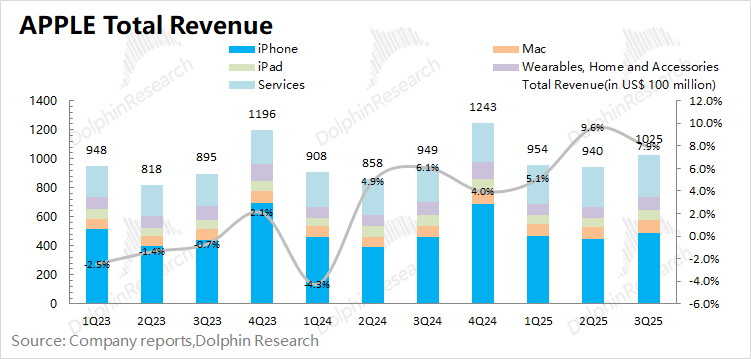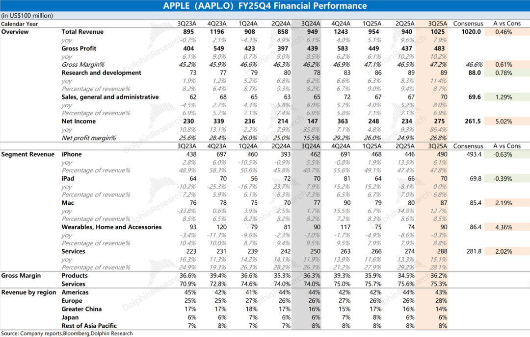 2. iPhone: The iPhone division recorded $49 billion in revenue, a 6.1% YoY increase, slightly falling short of market expectations of $49.3 billion. The launch of the iPhone 17 series drove this growth. According to Dolphin Research, iPhone shipments grew by 4.6% YoY, with the average selling price (ASP) rising by 1.4%.