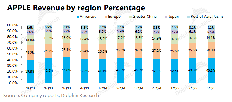 5. Regional Revenue: The Americas continued to be Apple's largest market, accounting for 43% of the revenue and experiencing a 6.1% YoY increase. Greater China was the only region to see a revenue decline (-3.6% YoY), affected by subsidy policies and delayed launches of the iPhone Air.