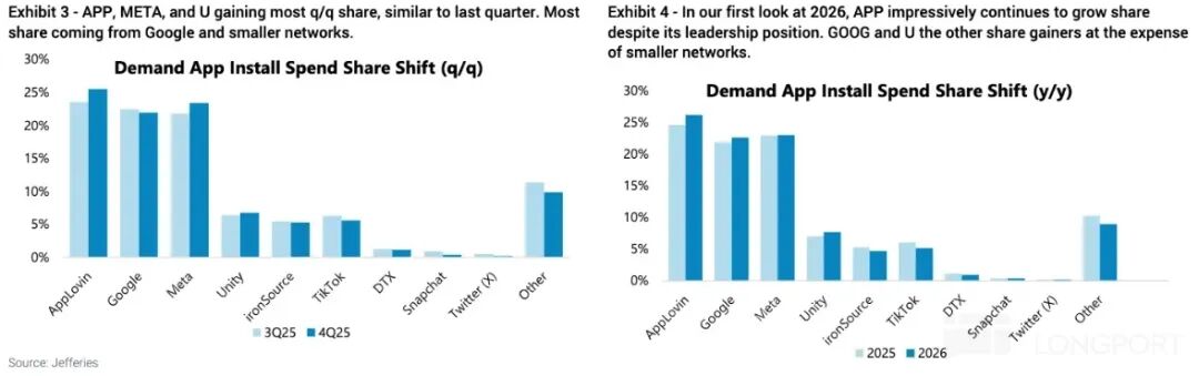 During this transition, small and medium-sized platforms with poor conversion rates are prone to further losing market share. In Q3, ironSource's market share slightly declined. Meanwhile, based on the current status of ironSource, advertisers surveyed indicated that their budget allocation to ironSource in 2026 would continue to decrease.