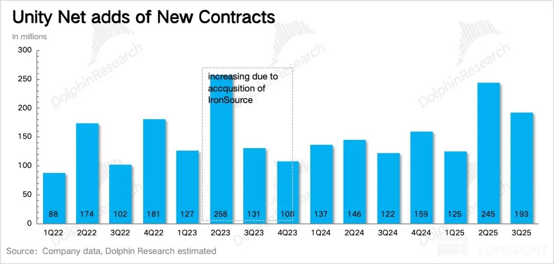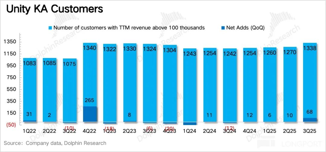 (3) The number of major clients saw a net quarter-on-quarter increase of 68, a truly remarkable and beyond-expectation figure. To witness a net increase of this scale, excluding new additions from external mergers and acquisitions like the acquisition of ironsource, one would have to go back to Unity's peak period in 2021. We estimate that, in addition to contract upgrades for Unity 6's existing customers, the main incremental growth comes from advertising clients under Vector.