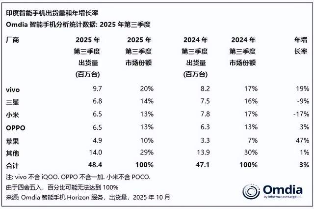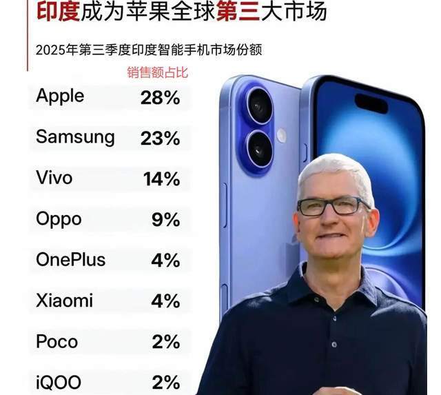Recently, an agency released the smartphone market share rankings for the third quarter of 2025, based on sales figures. The data reveals that Apple, with 28% of sales, has claimed the top spot in the Indian market.