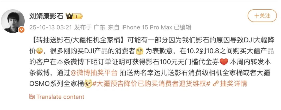 In a Weibo post, he mentioned that DJI's significant price reductions were somewhat related to Insta360. To express his apology, customers who purchased DJI products between October 2nd and October 8th could receive a 100 yuan no-threshold voucher from Insta360 by sharing their order proof.