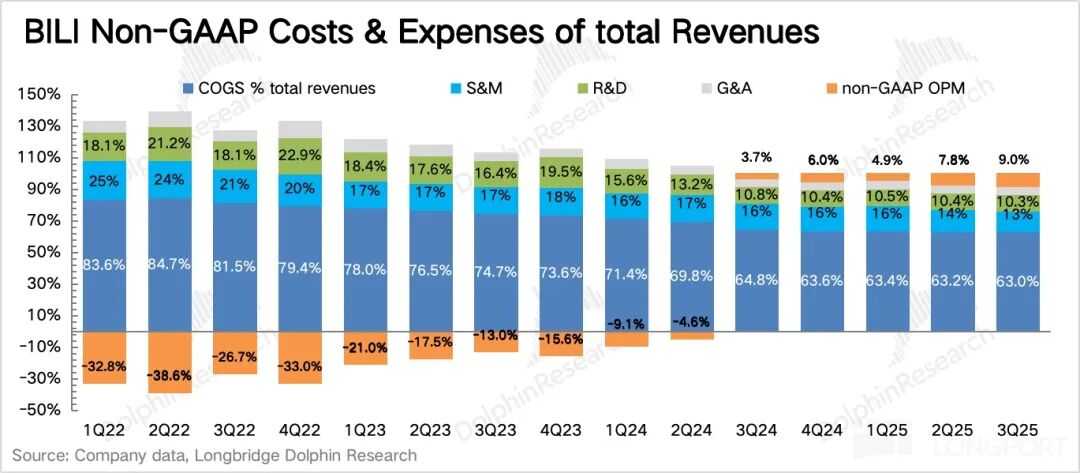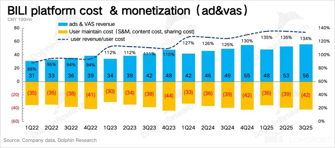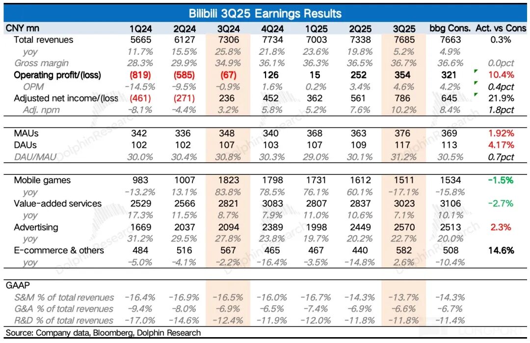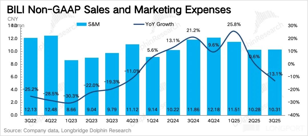 In Q3, Bilibili's profits continued to expand. From the perspective of core business operating profits (= gross profit - operating expenses), it reached RMB 350 million in the current period and RMB 680 million after adjustments, with optimizations in both cost and expense components.