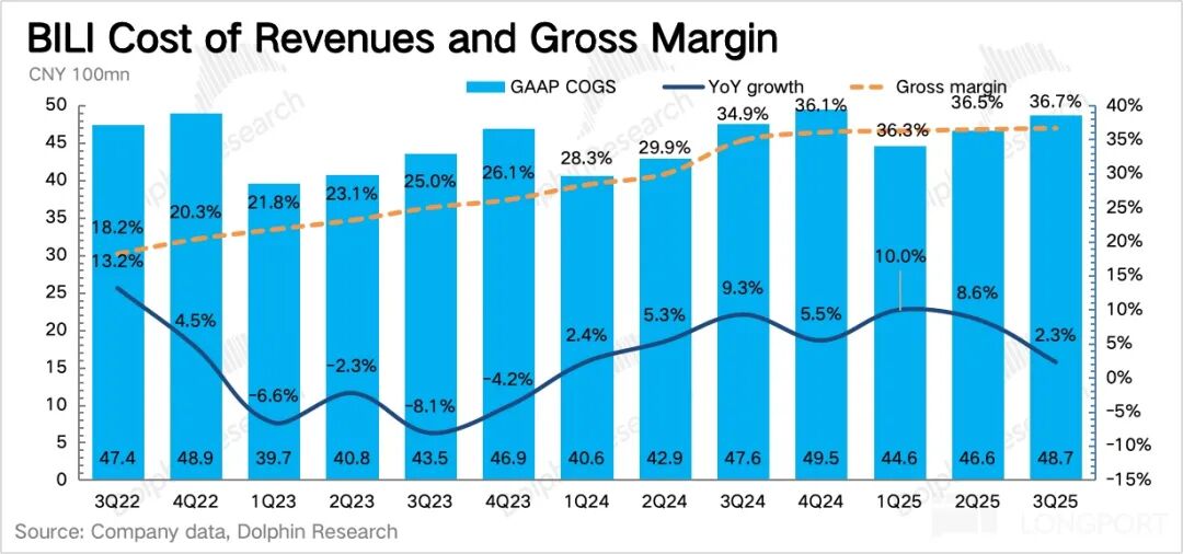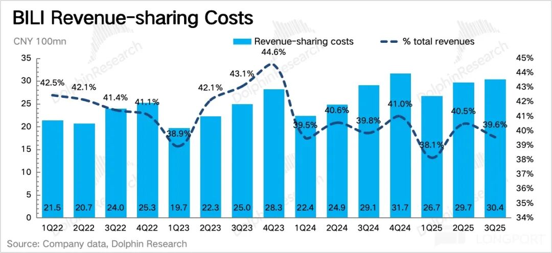In terms of specific cost structures, revenue-sharing costs account for the majority, primarily related to gaming, live streaming, and Huohuo Advertising. In Q3, revenue-sharing costs continued to increase to RMB 3.04 billion, with the growth rate significantly slowing to 4% due to the decline in gaming.