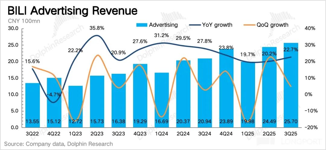 In Q3, Bilibili's advertising revenue exceeded RMB 2.57 billion, a year-over-year increase of 22%, surpassing guidance and expectations. Advertising growth primarily benefited from increased user time within the ecosystem (+16% year-over-year) and the company's upgrades to advertising algorithms, delivery systems, and AIGC creative tools. Over 50% of advertising materials are now automatically generated through AIGC, significantly improving production efficiency and conversion rates.