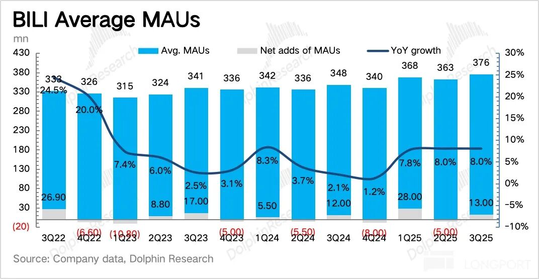1. Healthy Expansion of the User Ecosystem: This is the biggest highlight of the financial report, according to Dolphin Research. Q3, being the peak summer season, saw Bilibili's monthly active users (MAU) increase by 13 million month-over-month, with the DAU/MAU ratio rising to 31.2%. The re-expansion of Bilibili's ecosystem began earlier this year. Last year, due to slowing MAU growth, the company temporarily stopped disclosing MAU metrics and shifted focus to DAU.