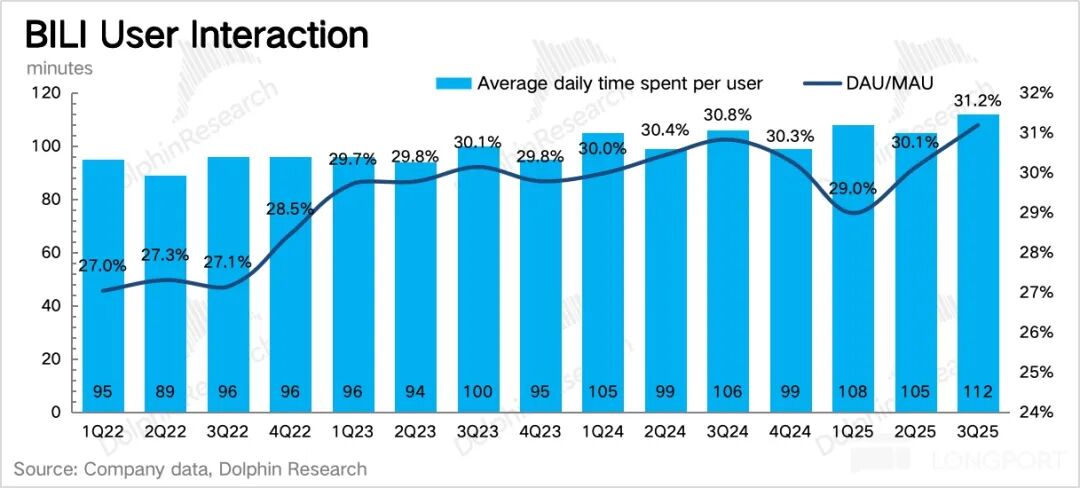Engagement metrics have also improved simultaneously, with the DAU/MAU ratio increasing to 31% and user time reaching a record high of 112 minutes, an increase of 6 minutes year-over-year.
