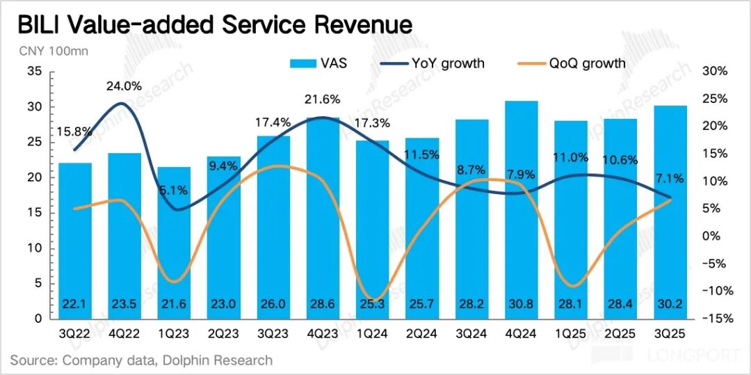 VAS revenue, primarily from live streaming and premium membership subscriptions, increased by 7% year-over-year in Q3, with a significant slowdown in quarter-over-quarter growth.