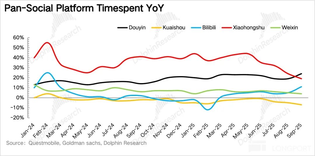 Looking at the social platform industry, according to Questmobile's tracking of platform user total time growth data, in Q3, Bilibili and Douyin (TikTok) showed upward trends in growth, while Xiaohongshu's (Little Red Book) growth started to slow significantly, and Kuaishou's decline widened.