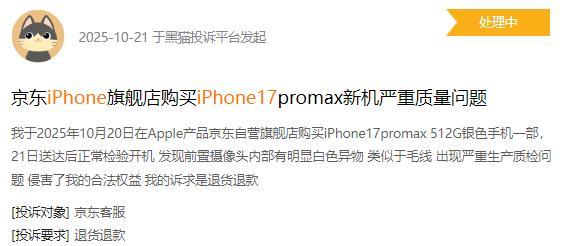 For example, a netizen complained on the Heimao Complaint Platform that the iPhone 17 Pro Max version they purchased from the Apple JD.com Self-Operated Flagship Store had a noticeable white foreign object inside the front camera upon normal startup, suspecting a 'severe production quality control issue.'