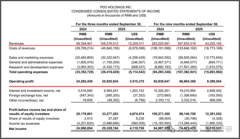 The third-quarter financial report revealed that Pinduoduo's total revenue reached 108.28 billion yuan, marking a year-on-year increase of approximately 9%. This continues the slowdown trend observed since 2024. Operating profit (non-GAAP) stood at 25.026 billion yuan, with a mere 3% year-on-year growth. Net profit attributable to the parent company was 29.328 billion yuan, up 17.4% year-on-year but down 4.63% sequentially.