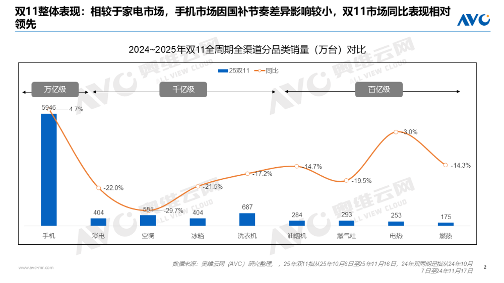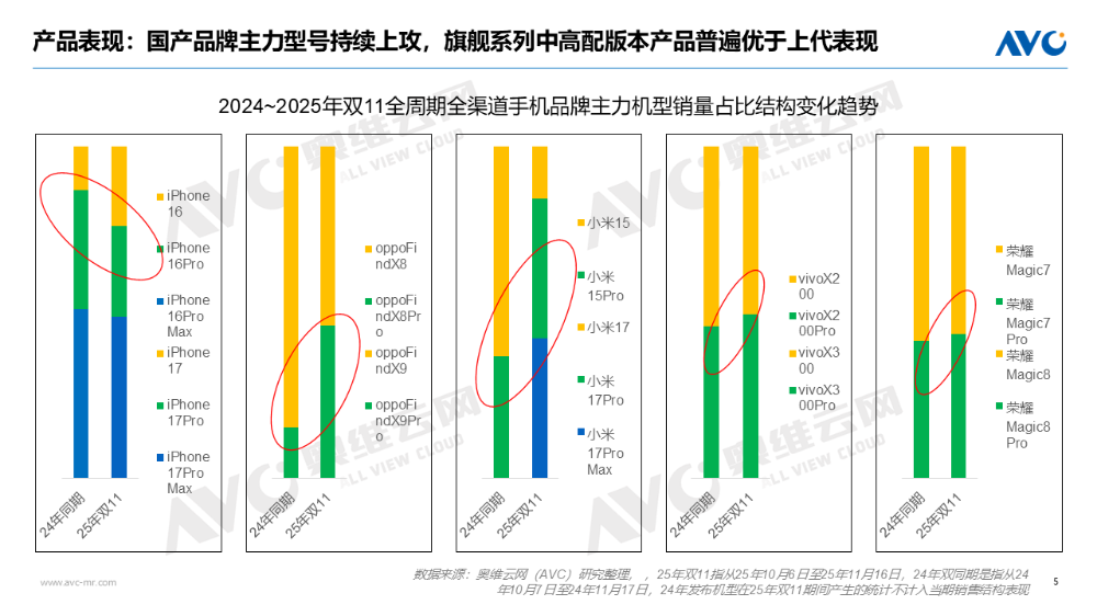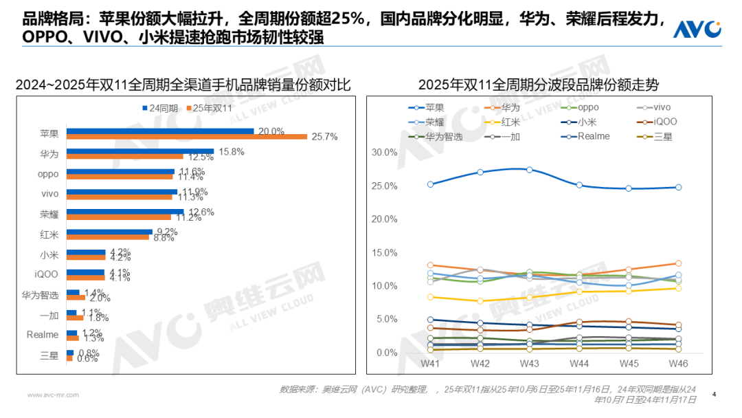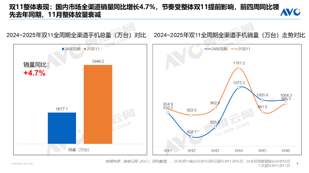 In terms of timing, influenced by the earlier commencement of this year's Double 11 and the advance release of new products by certain brands, the overall Double 11 rhythm further diverged from that of 2024. Mobile phone sales in the four weeks leading up to Double 11 significantly surpassed those of the same period last year. However, post-Week 45, as market demand was largely satiated, the overall momentum weakened. Although sales rebounded slightly in Week 46 with the rising popularity of some brands' November new product launches, there remained a gap in single-week performance compared to 2024.