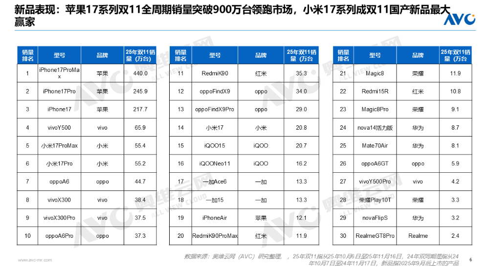 AVC's research indicates that from October 6th to November 16th, cumulative sales of the Apple iPhone 17 series exceeded 9 million units, dominating the top three best-selling products, with the iPhone 17 ProMax becoming the most popular choice among Double 11 flagships. Among domestic brands, the Xiaomi 17 series closely trailed Apple, with cumulative flagship sales exceeding 1.3 million units. The VIVO X300 series and OPPO Find X9 series followed with 760,000 and 630,000 units sold, respectively.