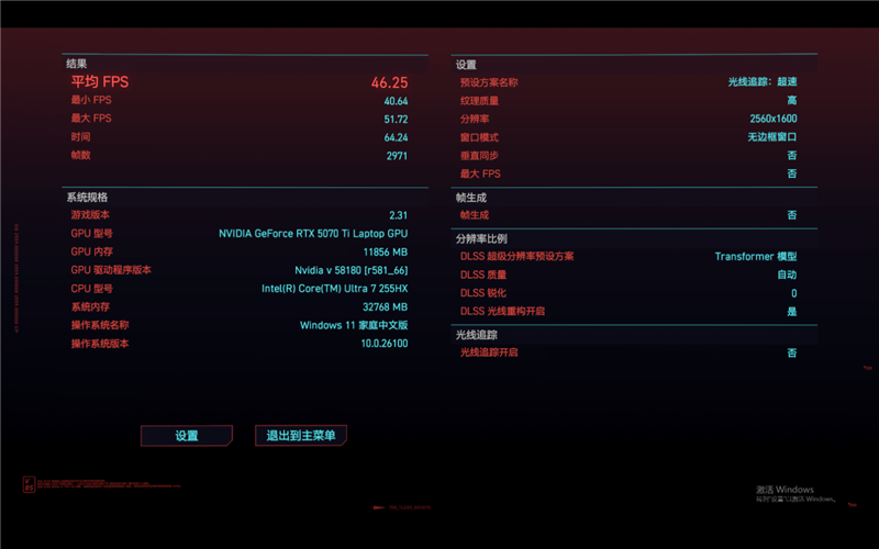In Cyberpunk 2077, using the highest quality preset and DLSS frame generation, the game frame rate at 2K resolution was recorded.