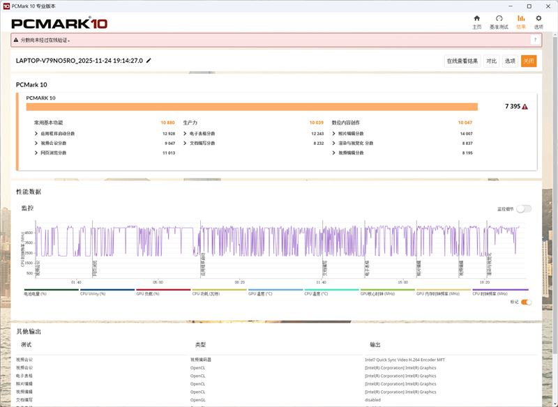 When using integrated graphics, we conducted a benchmark test using PCMark10's Modern Office scenario. The Colorful Jiangxing X16 Pro notebook scored 7395 in office performance.