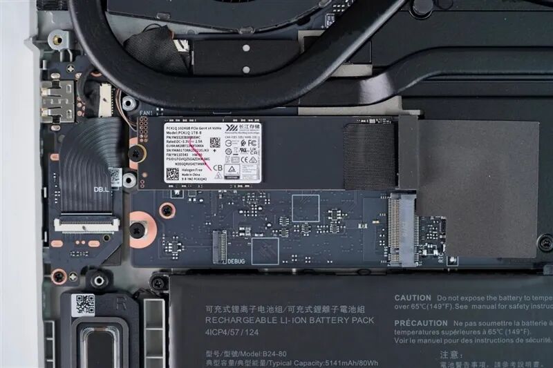 The Colorful Jiangxing X16 Pro laptop provides two M.2 slots, with one pre-installed with a 1TB PC41Q SSD from Yangtze Memory Technologies and the other slot vacant for easy user upgrades to expand storage.