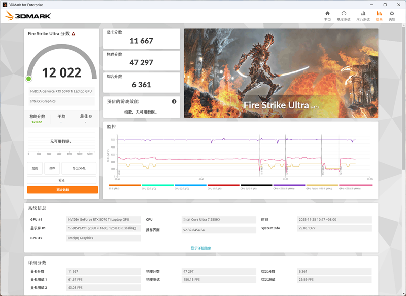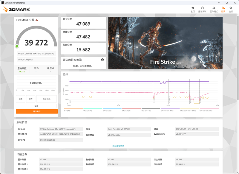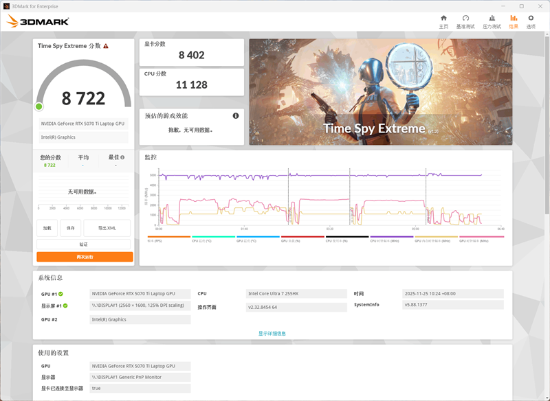 The NVIDIA GeForce RTX 5070Ti Laptop graphics card equipped in the Colorful Jiangxing X16 Pro laptop scored 17902 and 8402 in the 3Dmark Time Spy test.