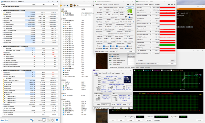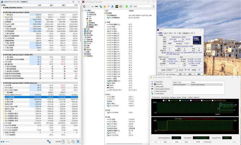 In terms of performance, the Colorful Jiangxing X16 Pro notebook's configuration approaches flagship levels. The Intel Core Ultra 7 255HX processor features a built-in NPU, 20 cores and 20 threads, with a maximum turbo frequency of 5.2GHz. During burn-in tests, it can stably release 115-125W of power, demonstrating exceptional performance.