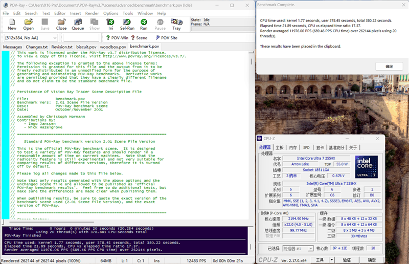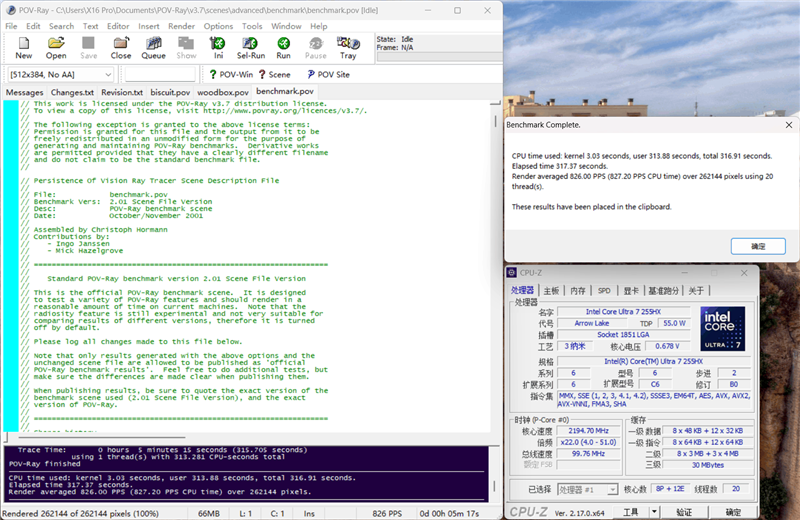 In the POV-Ray test, the single-core score was 826.00pps, and the multi-core score was 11976.06pps.