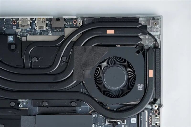 The Colorful Jiangxing X16 Pro laptop incorporates a dual-turbine fan high-efficiency cooling system with six heat pipes and four air outlets on three sides. It uses phase-change thermal materials internally, stably releasing 205W of power.