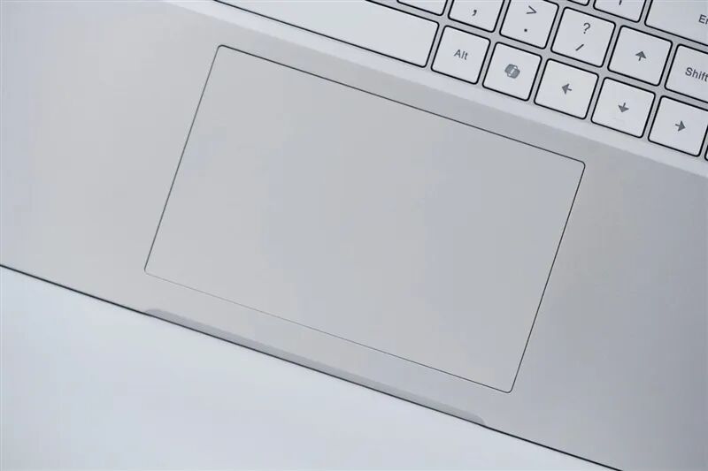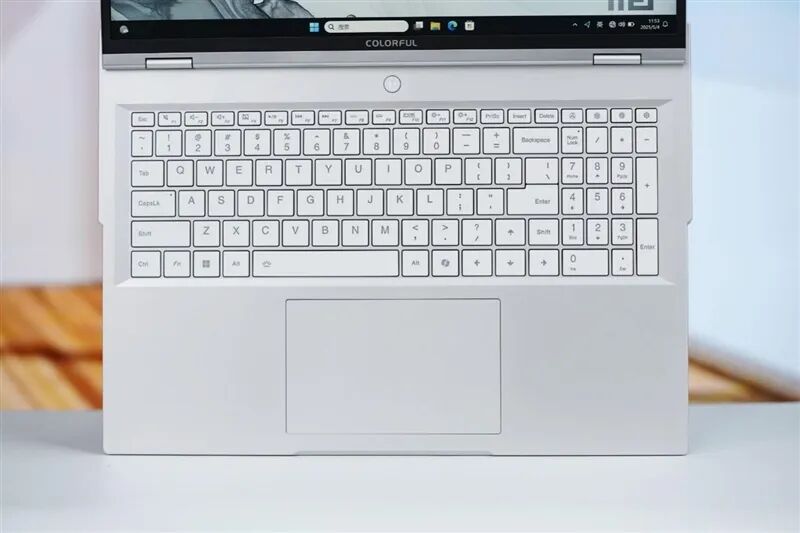 The C-face of the Colorful Jiangxing X16 Pro laptop is also silver-white. Thanks to the spacious 16-inch body, full-size keycaps make input easier, while a numeric keypad can be easily accommodated. An independent circular power button is placed above the keyboard area.