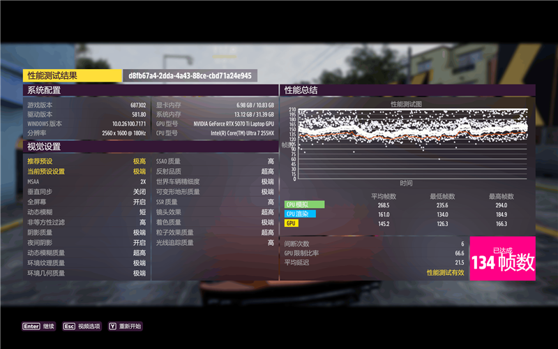 In Forza Horizon 5, using extreme quality settings at 2K resolution, the final test result was 134fps.
