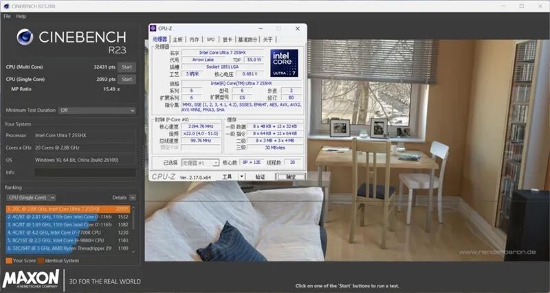 CINEBENCH R23 test results: CPU scored 2093pts in single-core performance and 32431pts in multi-core performance.