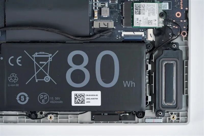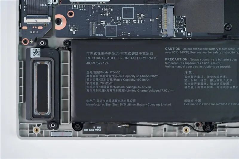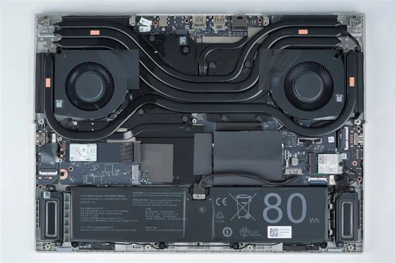 The Colorful Jiangxing X16 Pro laptop features an 80Wh battery, with large speaker resonance chambers placed on both sides of the battery.