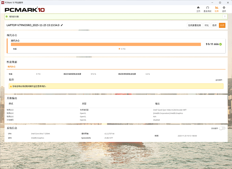 With the same settings, we conducted a battery test in PCMark10 using the Modern Office scenario to test the battery life of the Colorful Jiangxing X16 Pro notebook. The final battery life result was 9 hours and 11 minutes, with the 80Wh battery being sufficient to complete a full day of work in office mode.