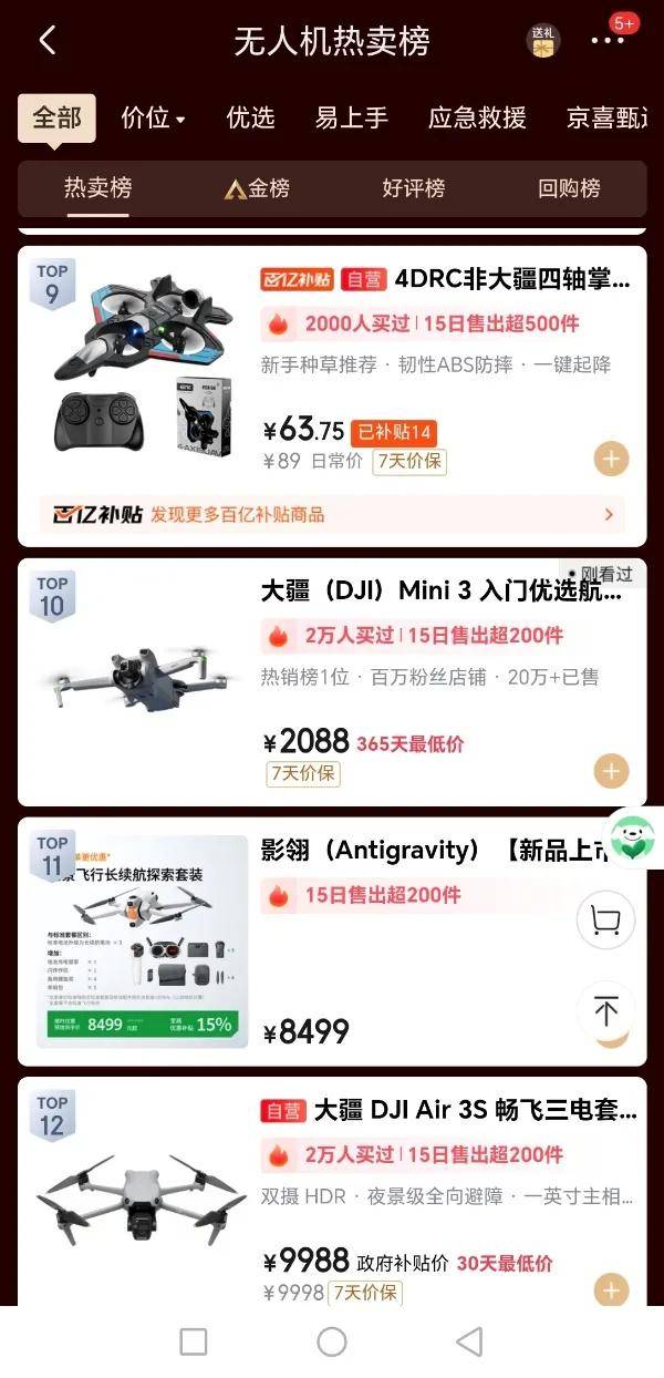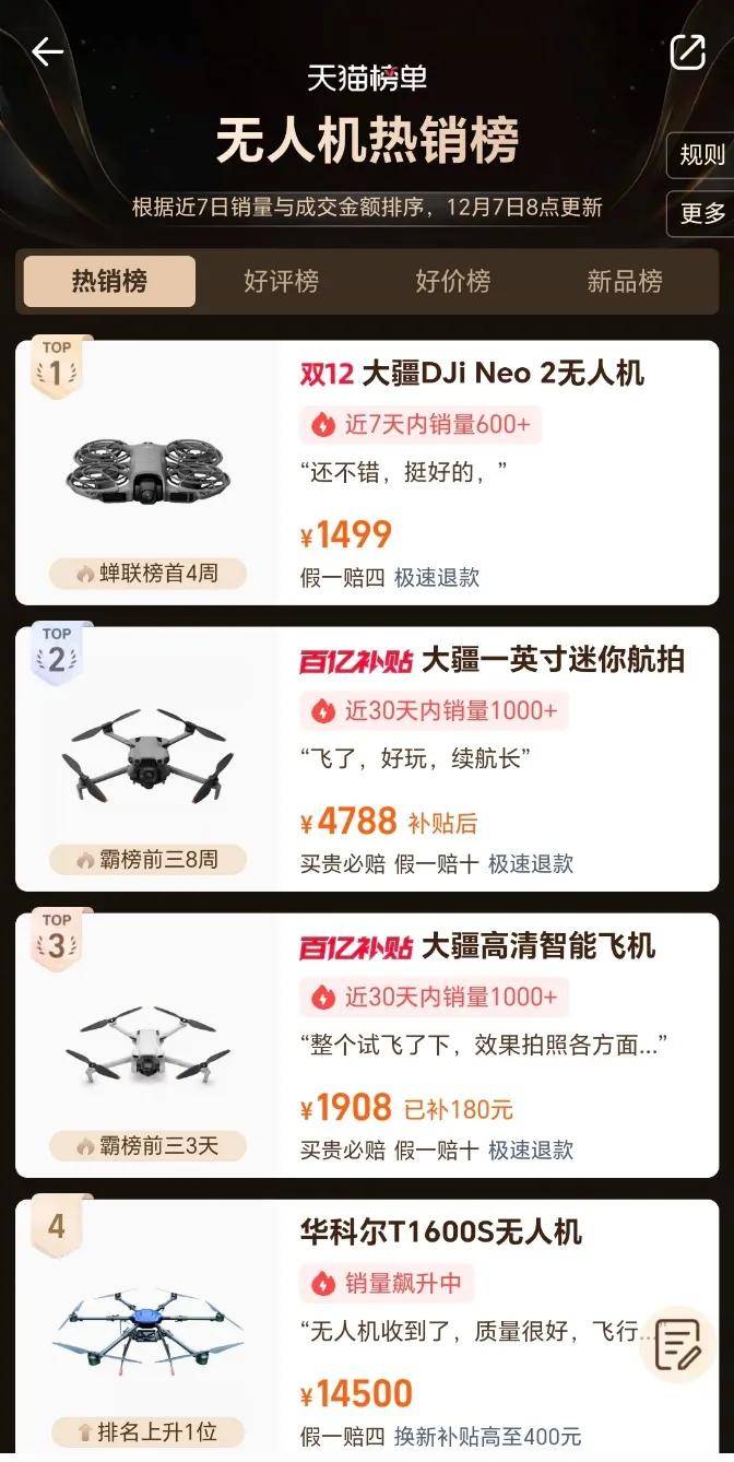 From the drone rankings on Tmall and JD.com, the top three spots on both e-commerce platforms were dominated by DJI, with Yingling A1 failing to make it into the top ten on either platform.