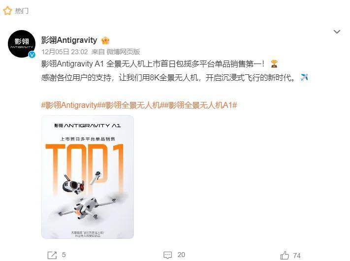 At 11:00 PM on December 5th, Yingling's official Weibo account claimed that the Antigravity A1 panoramic drone had topped sales charts across multiple platforms on its first day of release.