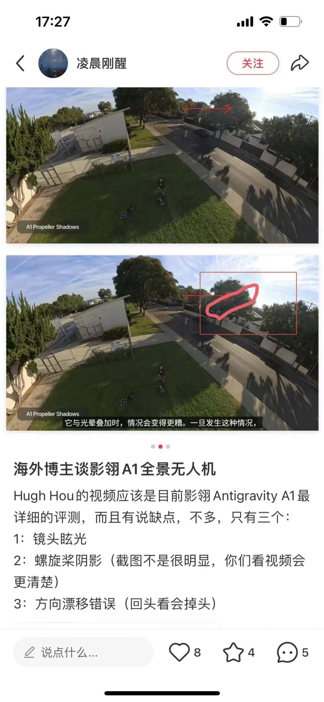 On Xiaohongshu, an overseas blogger mentioned three drawbacks of the product: lens flare, propeller shadows, and directional drift errors.