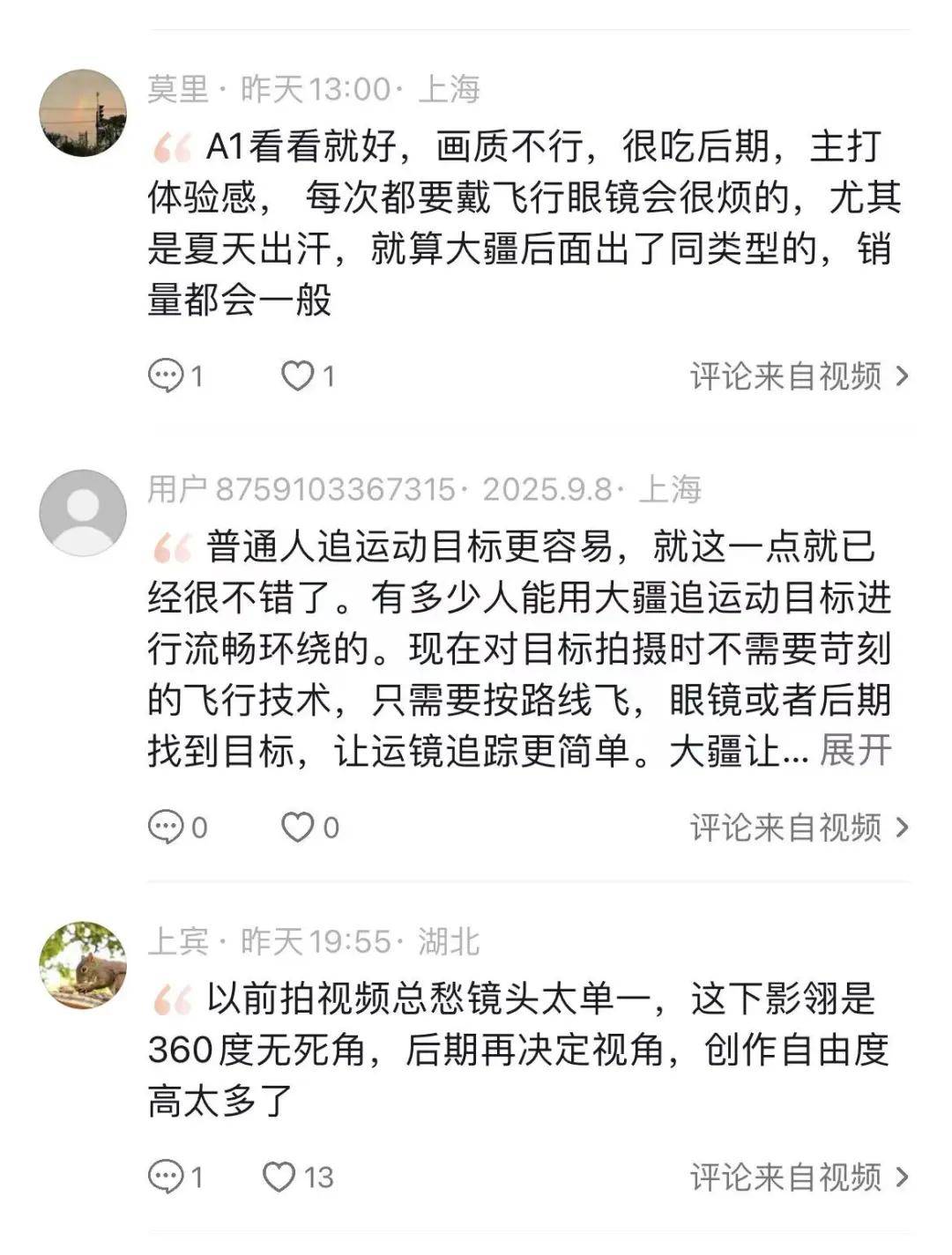 On Xiaohongshu, a blogger named Chaochao Digital believes the product has positioning issues: If it aims to be a professional aerial photography tool, its current image transmission and quality details are insufficient to meet the needs of professional creators. If it targets the recreational flight market, the device's dizziness issues may deter many players.