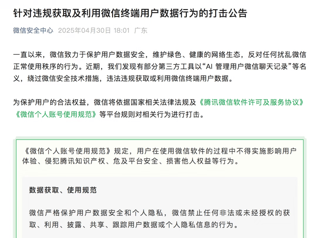 Notably, in April of this year, WeChat issued an announcement reminding users not to use third-party tools to manage WeChat chat records. Subsequently, voice assistants like Siri, Xiao Ai, and Huawei Xiaoyi could no longer directly invoke WeChat functions via voice.